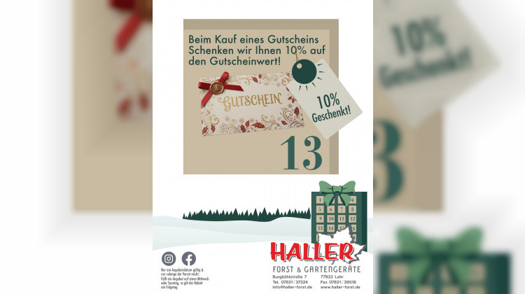 Beim Kauf eines Gutscheins bekommst du 10 Prozent geschenkt. Ideal zum Verschenken oder selbst Einlösen. Heute bei Haller Forst und Gartengeräte. Solange verfügbar.